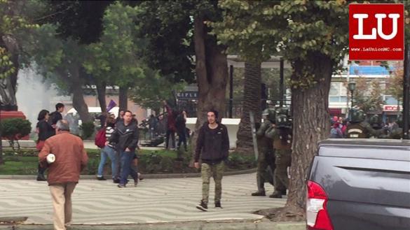 Por muchas razones aquel estudiante no quiso seguir ahí, seguramente para evitarse un mal mayor. Pero en la plaza de al frente donde todos quienes habían decidido salirse de los “enfrentamientos”, un hombre aparece muy agresivamente junto a su mujer gritando y zamarreando a otro joven que nada tenía que ver con los estudiantes ahí presentes, el motivo de esta riña callejera fue descrito por el mismo JOSE BRIGANTI como “ME RAYÓ LA CASA”, “NO TIENE PORQUE RAYAR MI PROPIEDAD PRIVADA”. Aquel joven, Ignacio Mardones, reconocido como el productor del rayón, nerviosamente le pide al caballero disculpas, quien no las aceptó.