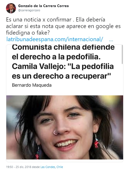 En ella consignaba que “es una noticia por confirmar. Ella debería aclarar si esta nota que aparece en Google es fidedigna o fake? (sic)”, mientras linkeaba un artículo que señalaba que “Comunista chilena defiende el derecho a la pedofilia. Camila Vallejo: “La pedofilia es un derecho a recuperar””.