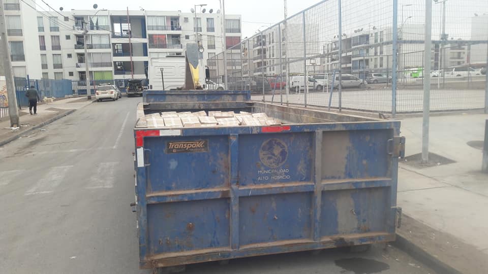 Tal como se ve en la fotografía el municipio de Alto Hospicio utilizó los contenedores que están destinado a la acumulación de basura para repartir las cajas de alimentos. El hecho fue considerado como «humillante» por parte de los vecinos, junto con los riesgos que significan para la salud, más en medio de una pandemia.