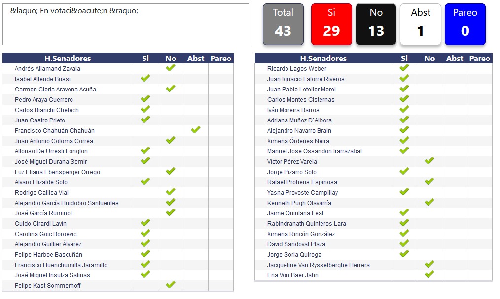 La iniciativa requería de a lo menos 26 votos a favor para ser aprobada, obteniendo una abultada victoria con 29 votos positivos. Estos son los mismo que requeriría de ser vetada por el presidente Sebastián Piñera, quien había manifestado la intención de realizar dicho acto en caso de ser aprobada.
