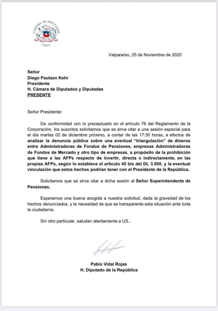El parlamentario de Revolución Democrática hizo la solicitud ante los antecedentes entregados por Felices y Forrados. En la denuncia se acusa al presidente y su familia de realizar una triangualción ilegal con fondos de pensiones.